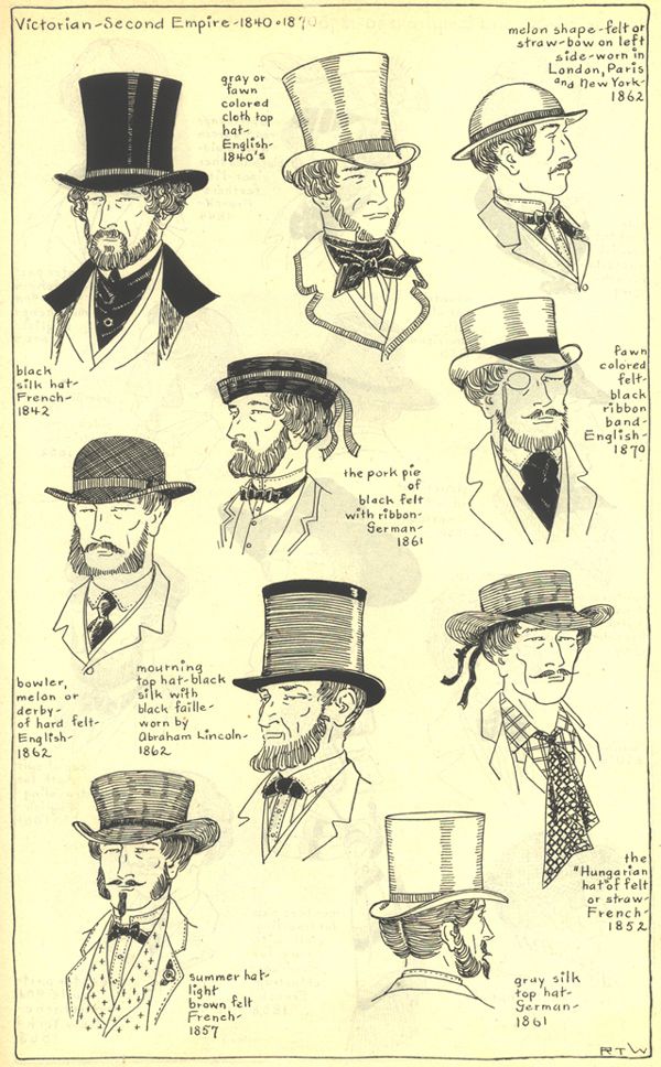 Men were always expected to wear a hat in public but remove it indoors. Top hats were standard for men of high social and economic status, while others wore them on formal occasions. Other popular Victorian men’s hats included the wide-brimmed “wide-awake” hats and the “porkpie” hat.